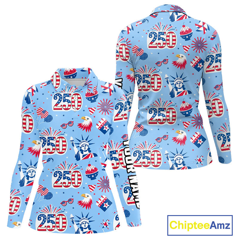 America 250th Anniversary Womens Long Sleeve Golf Polo Shirt, Patriotic USA Golf Shirts, Golf Gift NHN0232