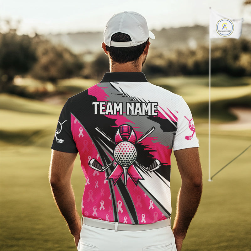 Mens golf polo shirt Custom pink ribbon pattern mens golf clothes, Breast cancer shirt for golfer NQS10516