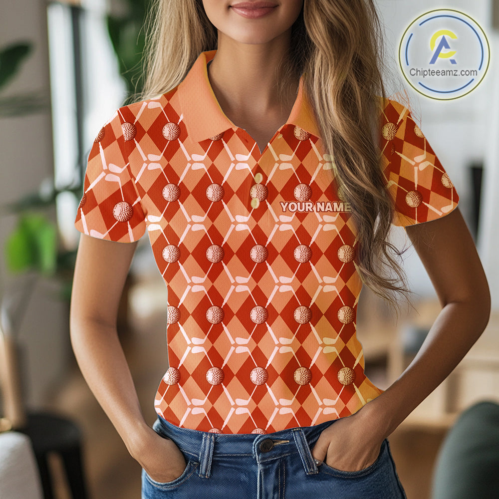 Women golf polo shirts custom orange argyle plaid pattern golf attire for ladies, golfer gifts NQS10436
