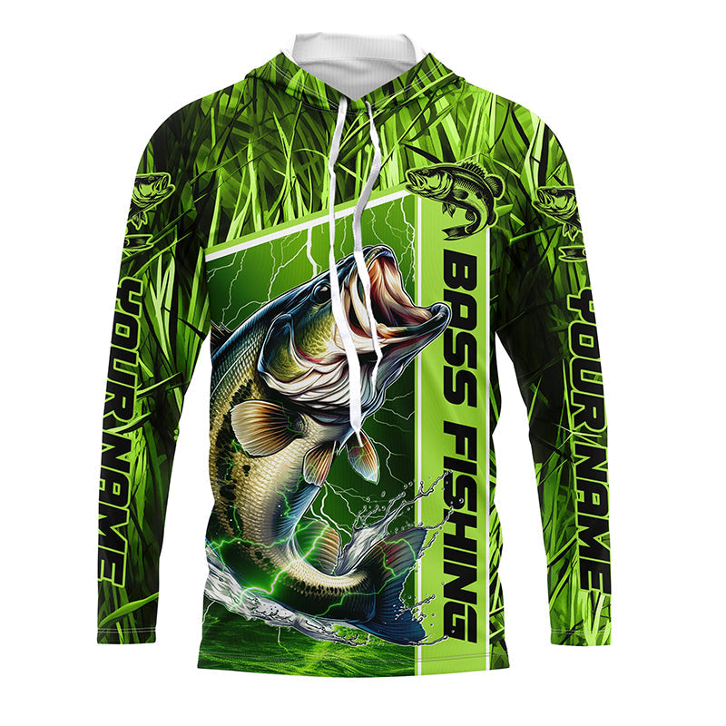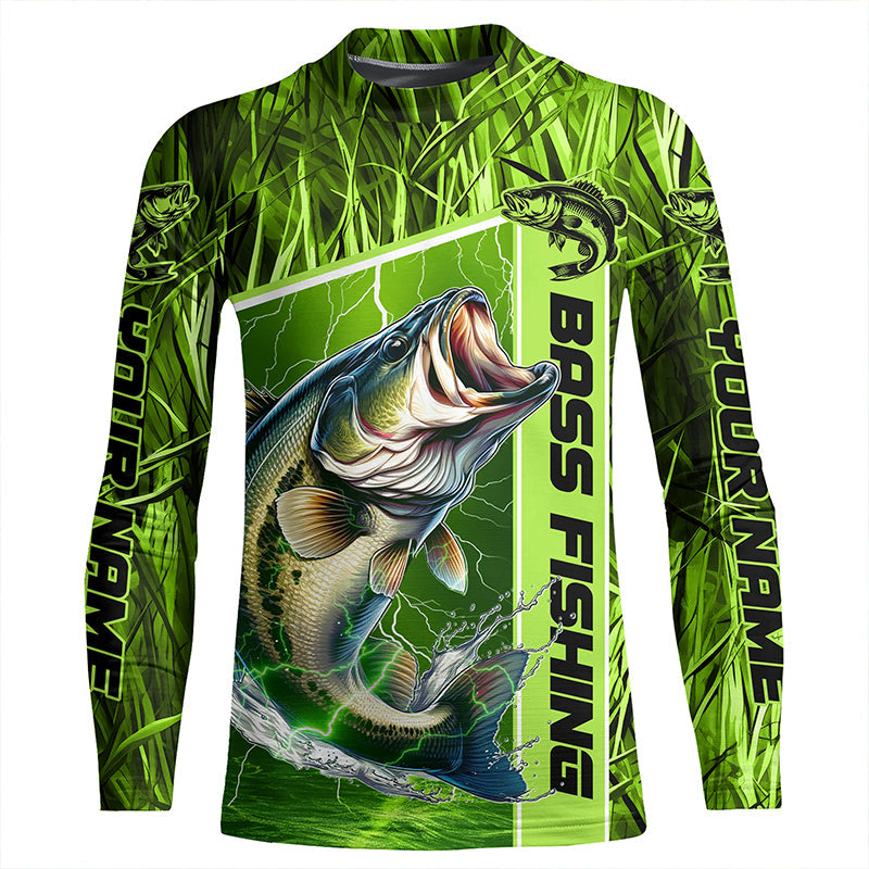 Custom Green Camo Bass Long Sleeve Tournament Fishing Shirts, Bass Fishing Jerseys IPHW5827