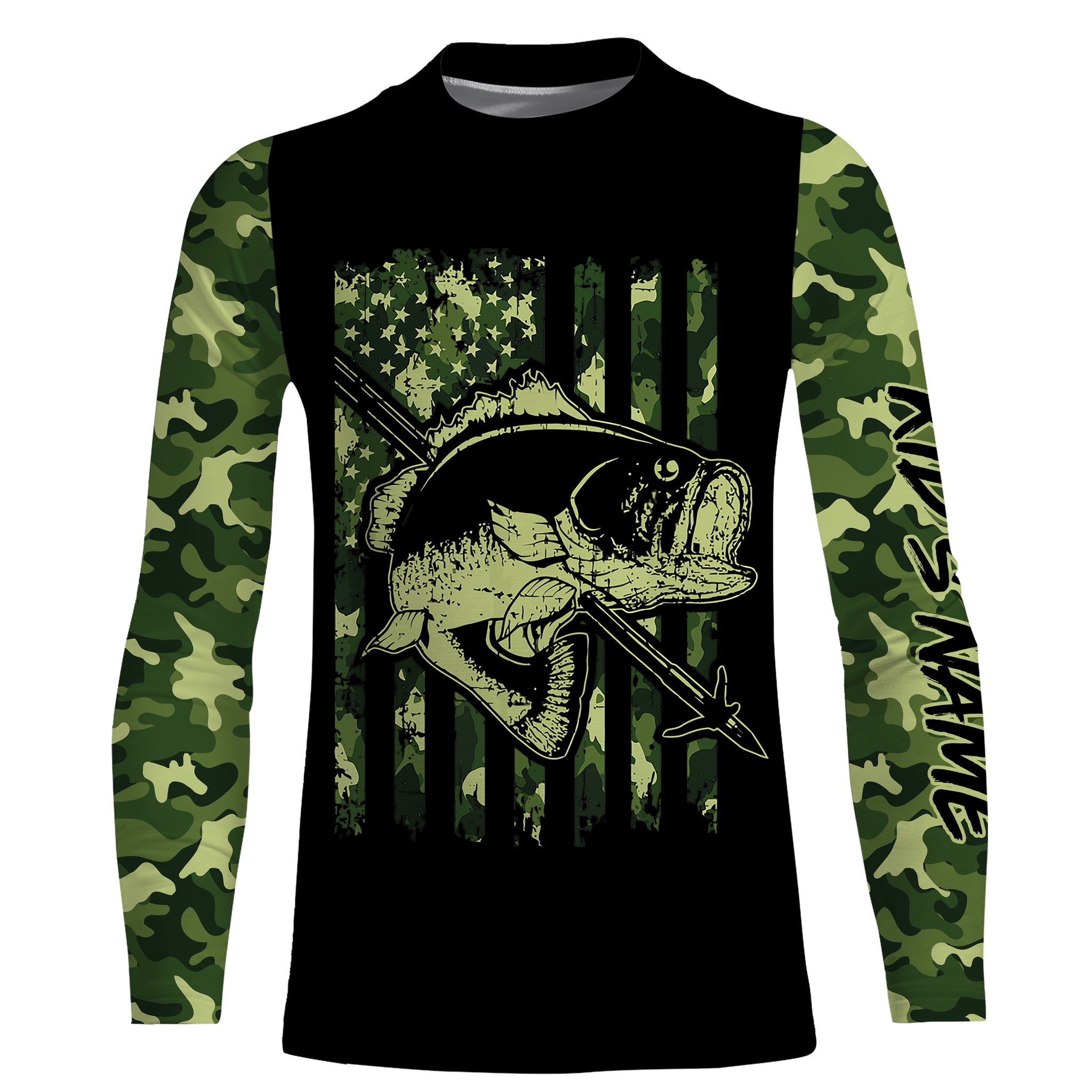 Largemouth Bass Bowfishing green camo American flag patriotic Custom sun protection fishing shirts NQS3355