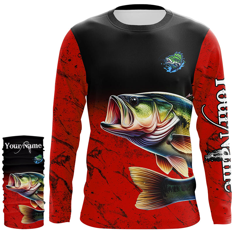 Largemouth Bass Fishing Custom red black long sleeve performance Fishing Shirt, Bass fishing jerseys NQS5071