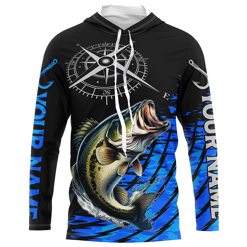 Personalized Bass fishing compass Long Sleeve Performance Fishing Shirts, Bass tournament Shirt | Blue NQS7576