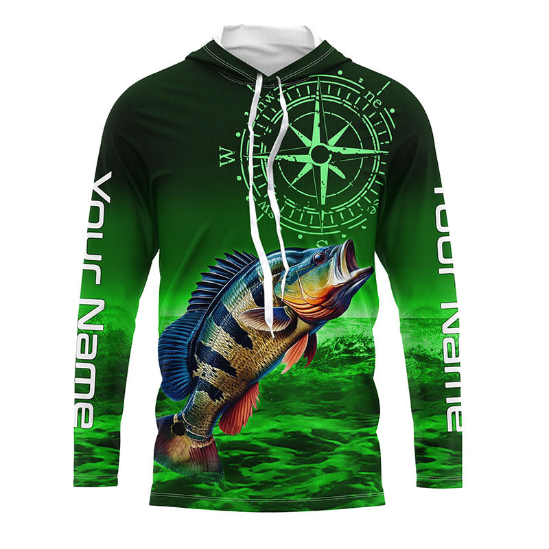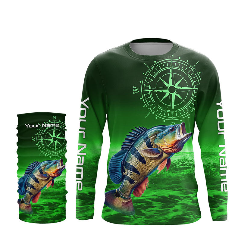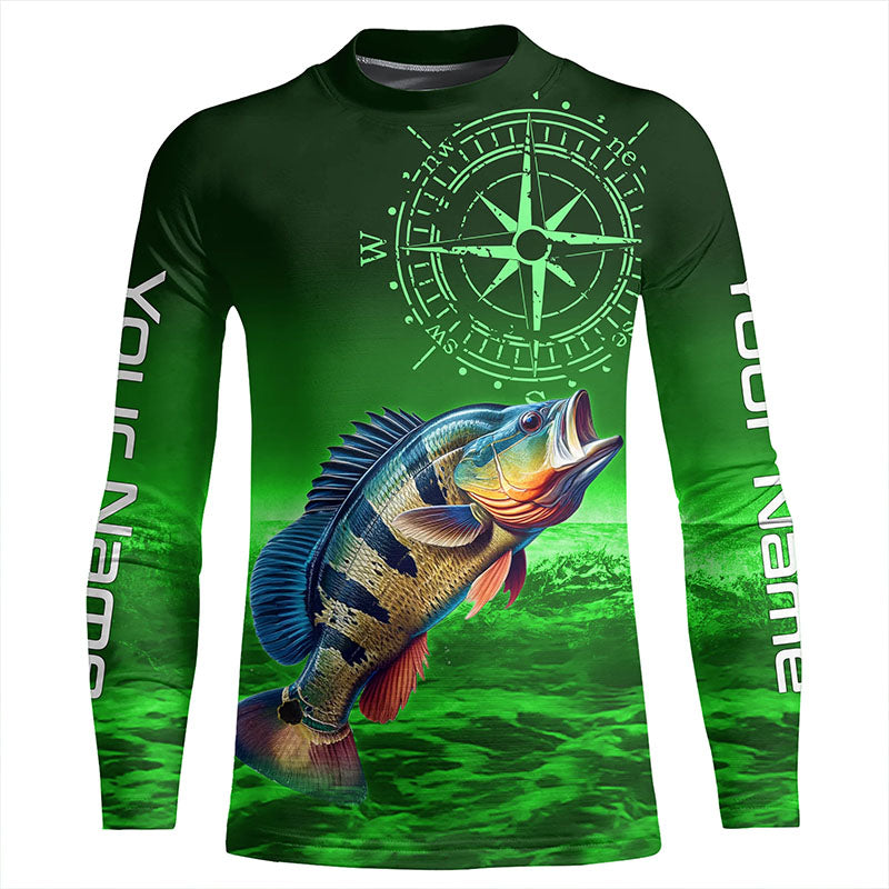 Personalized Peacock Bass Green Long Sleeve Performance Fishing Shirts, Bass compass tournament Shirts NQS6334