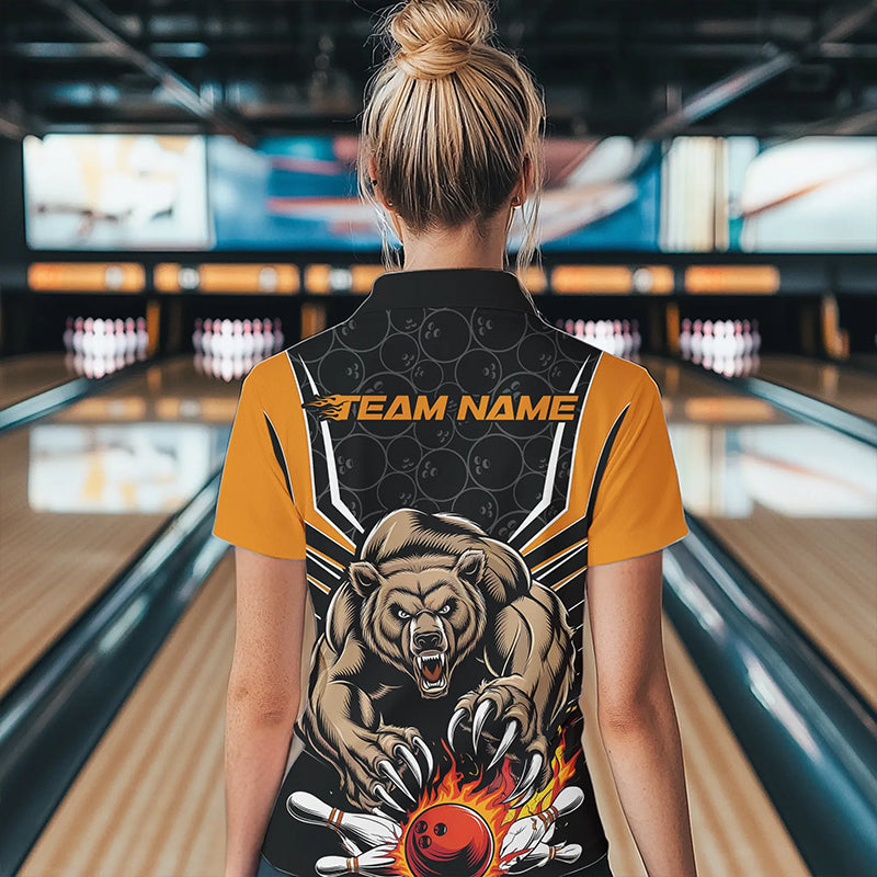 Black And Yellow Custom Bear Bowling Jerseys, Bear Bowling Team Polo Shirts For Women IPHW8831