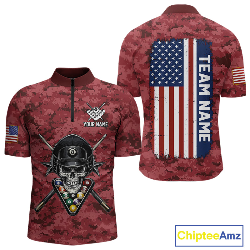 Personalized Red Camo Skull Billiard Shirt For Men Custom Patriotic US Flag Pool Team Jersey TDM5165