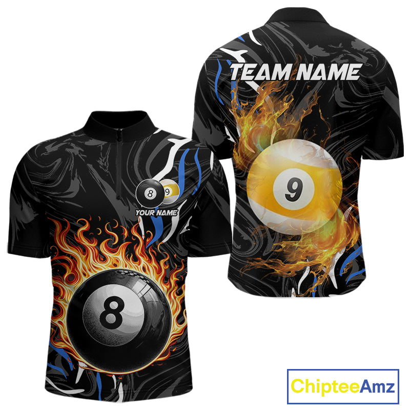 Personalized 8 Ball & 9 Ball Fire Flame Men Billiard Shirt, Billiard Jersey For Team Pooler |Blue TDM5209