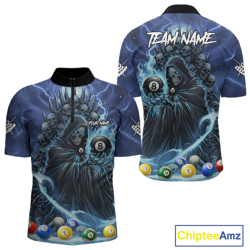 Blue Grim Reaper Lightning Billiard Shirt For Men Custom 8 Ball Pool Jersey Team Polo & 1/4 Zip TDM5292