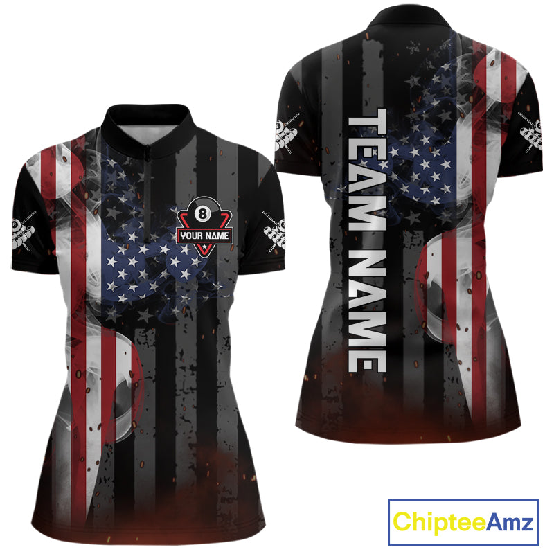 Personalized American Flag 8 Ball Billiard Shirt For Women, Patriotic Pool Team Jersey Polo, 1/4 Zip TDM4844