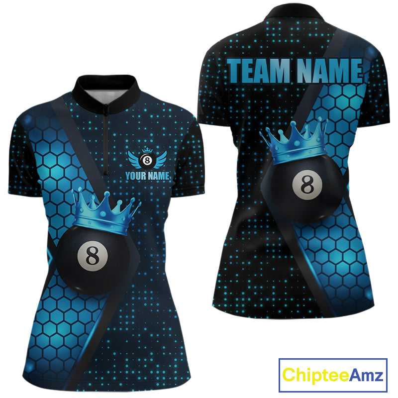 Personalized Blue 8 Ball Pool Crown Hexagon Billiard Shirt For Women, Billiard League Team Jersey TDM5046
