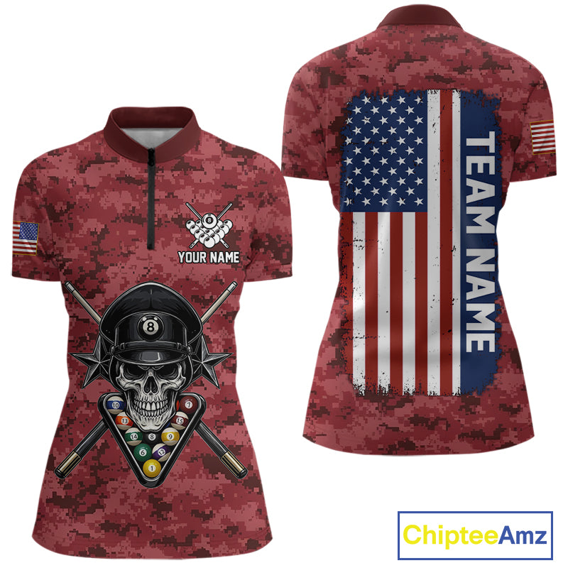 Personalized Red Camo Skull Billiard Shirt For Women Custom Patriotic US Flag Pool Team Jersey TDM5165