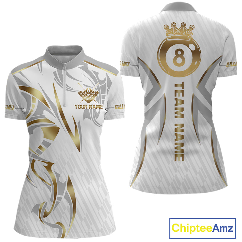 White And Gold Crown 8 Ball Women's Billiards Shirts Custom Billiard Jersey Team Polo & 1/4 Zip TDM5211