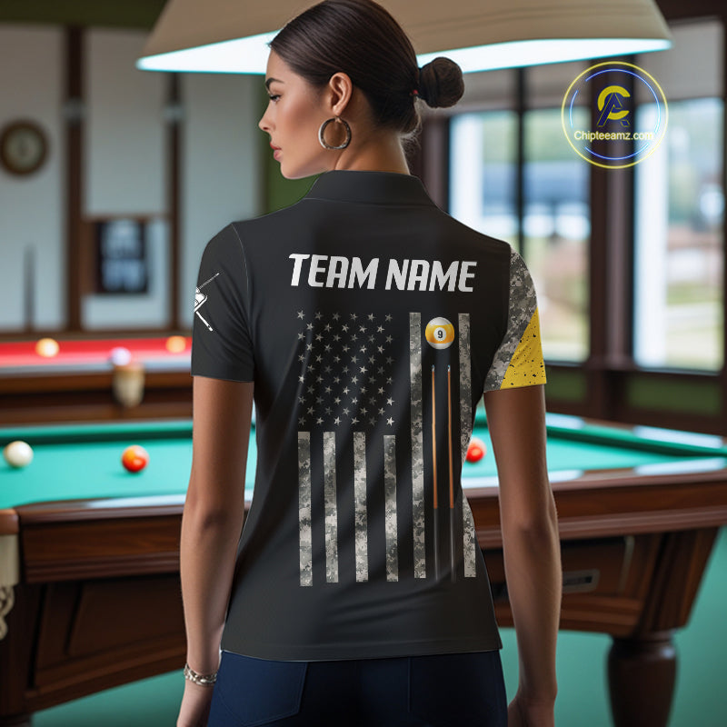 Personalized 9 Ball Camo Skull Billiard Shirt For Women, US Flag Pool Team Jerseys Polo & 1/4 Zip TDM5251