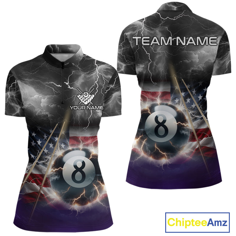Black Purple American Flag Thunder Lightning 8 Ball Billiard Shirt For Women Custom Pool Team Jersey TDM5267