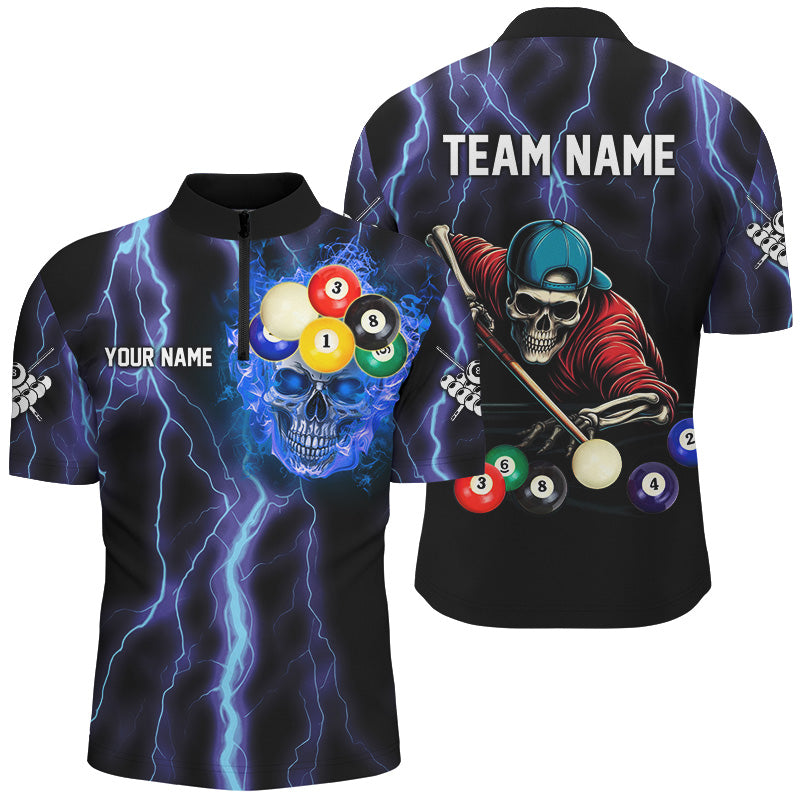 Personalized Thunder Lightning Blue Skull Men Billiard Shirts, Skeleton Billiard Balls Pool Jerseys TDM2993
