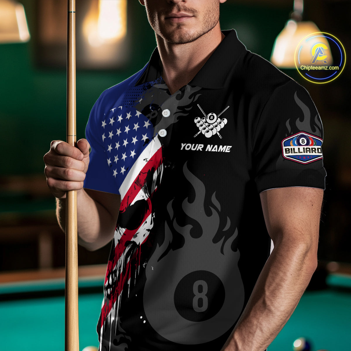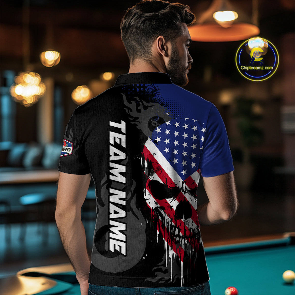 Grunge American Flag Skull 8 Ball Pool Custom Men Billiard Shirts, Patriotic Billiard Team Jerseys TDM3249