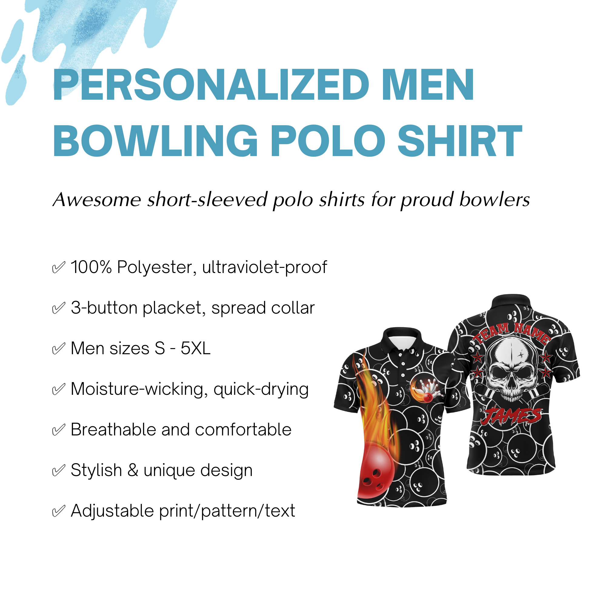 Personalized Men Flame Polo Bowling Shirt Cool Skull Pins Black Bowling Short Sleeve Men Bowlers NBP02