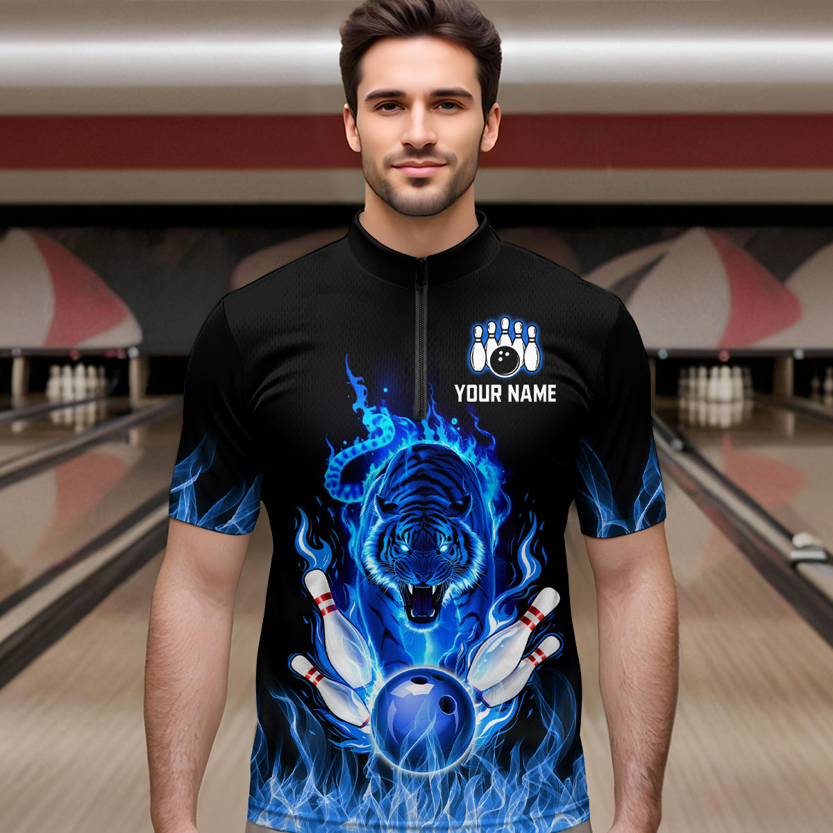 Blue Flaming Tiger Bowling Custom Men Bowling Polo & Quarter-Zip Bowling Team Jerseys HNT46
