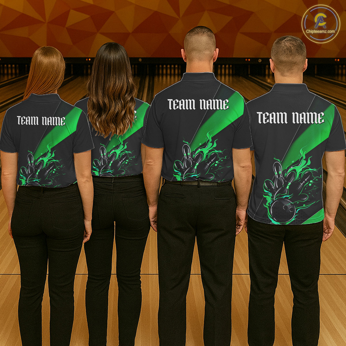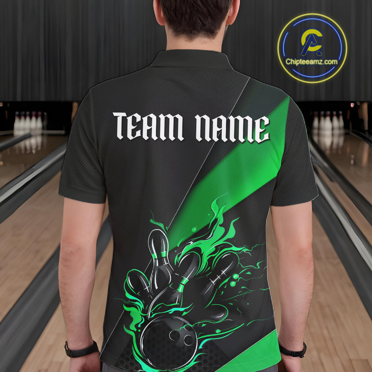 Black And Green Custom Flame Bowling Tournament Jerseys For Men, Bowling Team Shirts IPHW7926