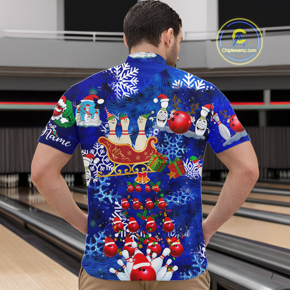 Mens Bowling Quarter-Zip Shirts Custom blue Christmas pattern Bowling Santa ball pins team Mens Jersey NQS6617