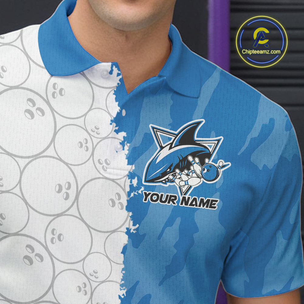 Custom White And Blue Shark Bowling Polo Shirts For Men, Shark Bowling League Shirt IPHW8993