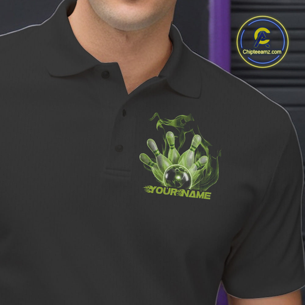 Custom Green Skull Smoke Bowling Team Men Polo Shirts, Halloween Bowling Outfit IPHW9773