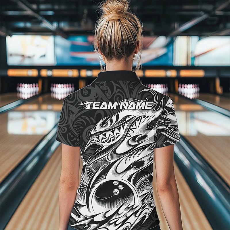 Custom Black And White Tribal Polynesian Bowling Women Polo Shirts, Niho Mano Bowling Shirt IPHW8812