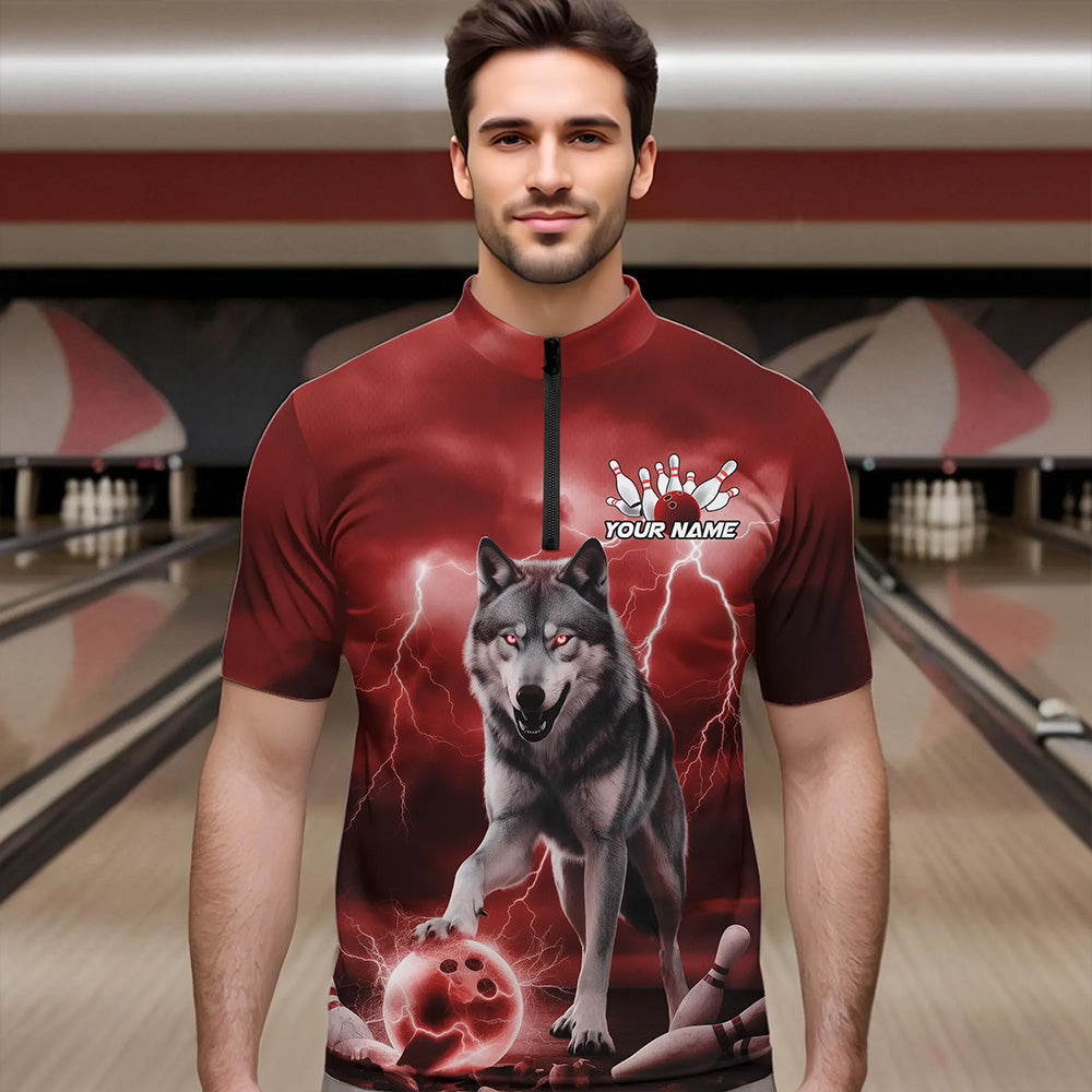 Red Thunder Lightning Custom Wolf Bowling Quarter-Zip Shirts For Men, Wolf Bowling Team Shirt IPHW8425