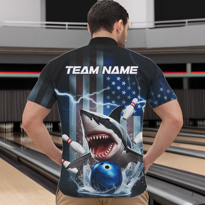 Custom American Flag Shark Bowling Men Quarter-Zip Shirt, Patriotic Shark Bowling Jerseys IPHW8944