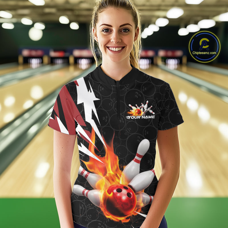 Custom Fiery Red Bowling Women Quarter-Zip Shirts, Inferno Flame Bowling League Shirt IPHW9526