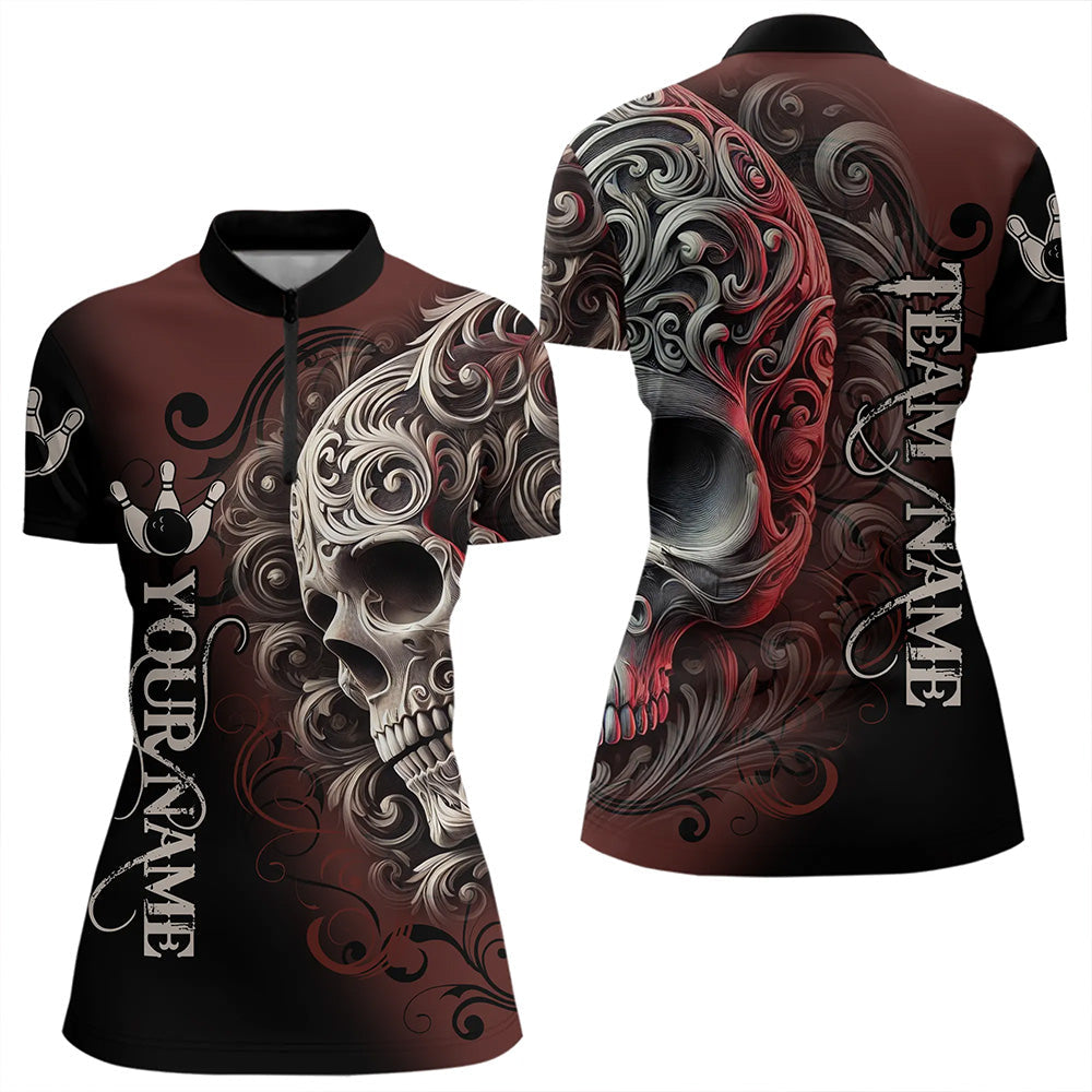 Red and Black Skull Scroll Women Bowling Polo, Quarter Zip Shirts Custom Skull Team bowling Jersey NQS9331