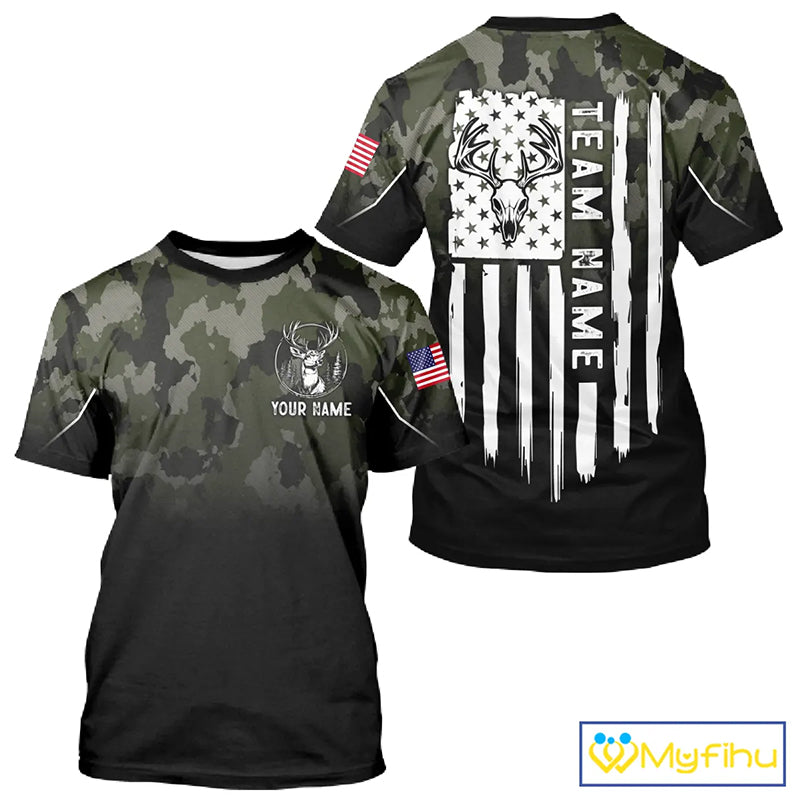 Black green camo American Flag Customize Name Patriotic Deer Hunting 3D All Over Printed Shirts NQS11360