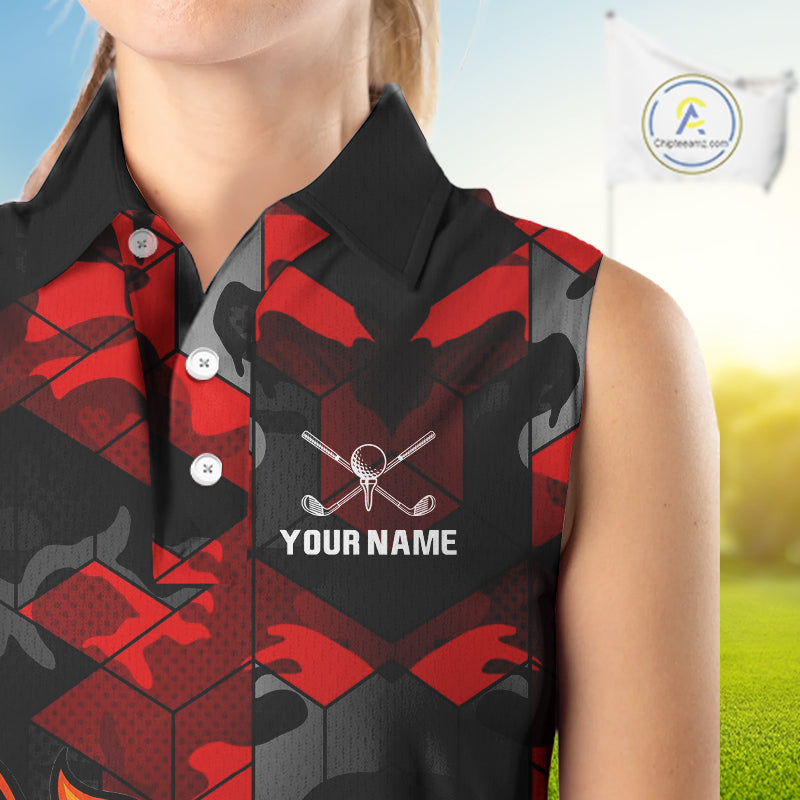 Black and Red Camo Flame Golf Ball Custom Womens Sleeveless polo shirts, golf top for ladies NQS10100