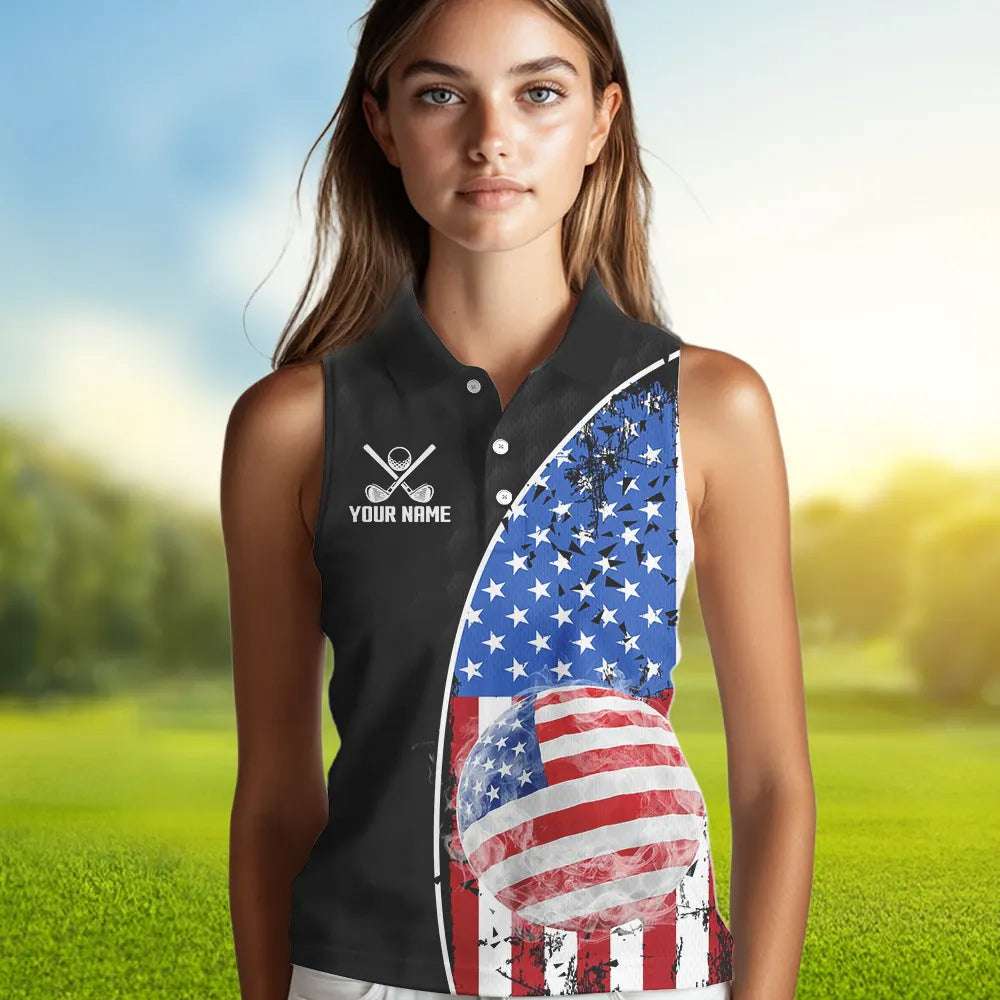 Personalized Black Camo Womens golf shirts sleeveless Custom American Flag patriotic golf shirt outfit NQS9698