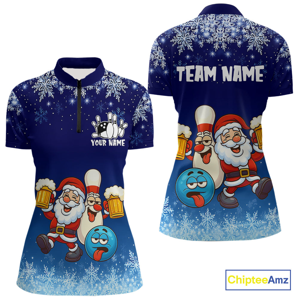 Funny Santa Drink Beer Blue snowflake Bowling Shirts For Women Custom Christmas Bowling Team Jerseys NQS11056