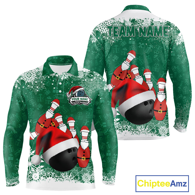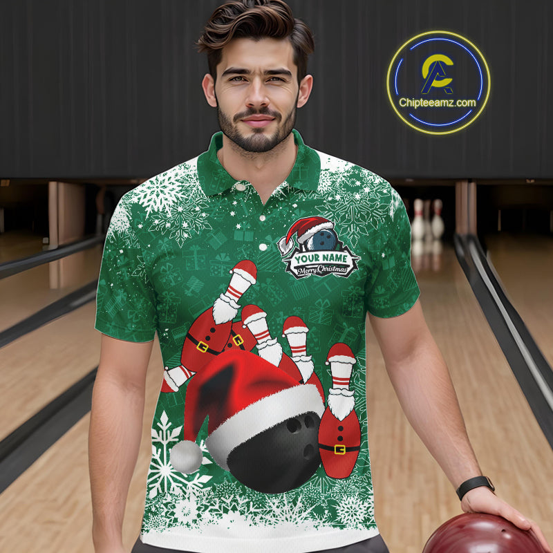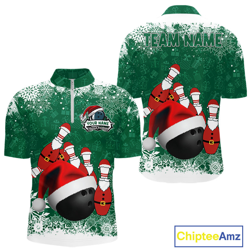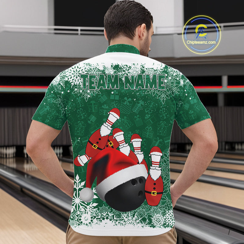 Mens bowling shirts Custom Funny Christmas snowflake Santa Bowling Ball pins Team Jersey | Green NQS11143