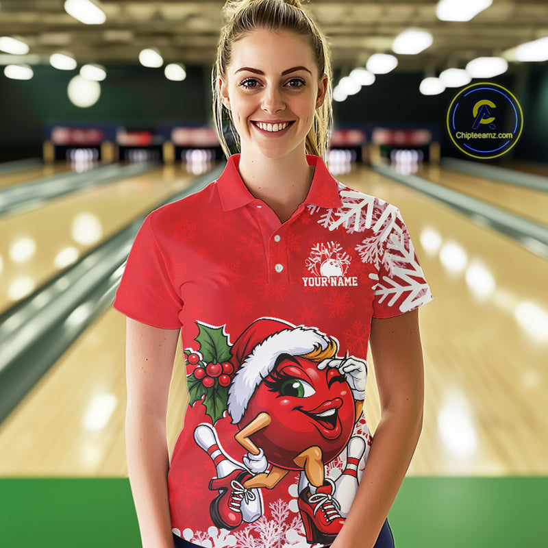 Custom Cute Funny Ladies Christmas Bowling Polo Shirts, Women Team Xmas Bowling Outfit IPHW10138