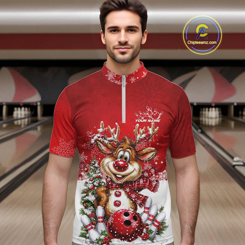 Custom Cute Funny Reindeer Christmas Bowling Men Quarter-Zip Shirts, Xmas Team Bowling Outfit IPHW10115