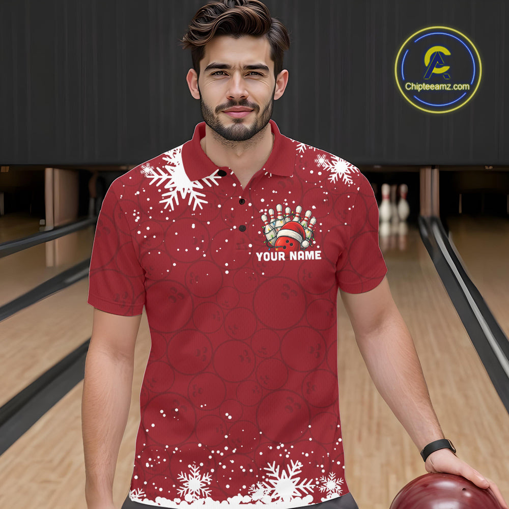 Red Christmas Bowling snowflake Men's Bowling Polo, Quarter Zip shirts Custom Xmas Bowling Outfits NQS10949