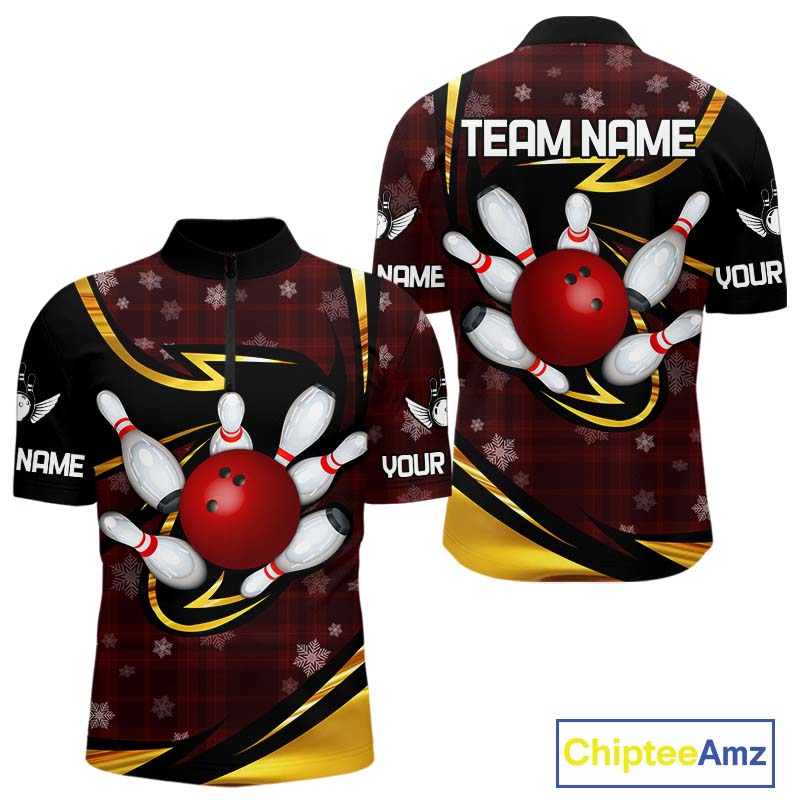 Red Christmas Plaid pattern snowflake Black and Gold Men's Bowling shirts Custom Xmas Bowling Gifts NQS10997