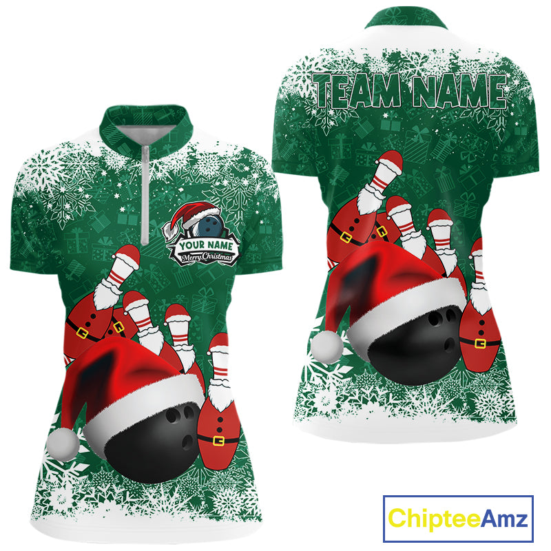 Womens bowling shirts Custom Funny Christmas snowflake Santa Bowling Ball pins Team Jersey | Green NQS11143