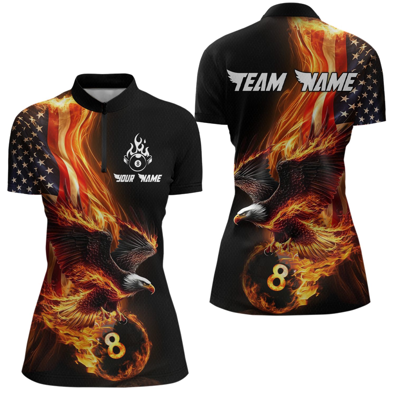 Custom Flaming US Flag Eagle Billiard Jersey for Women Billiard Shirt Billiard Gifts Polo & 1/4 Zip NNT58