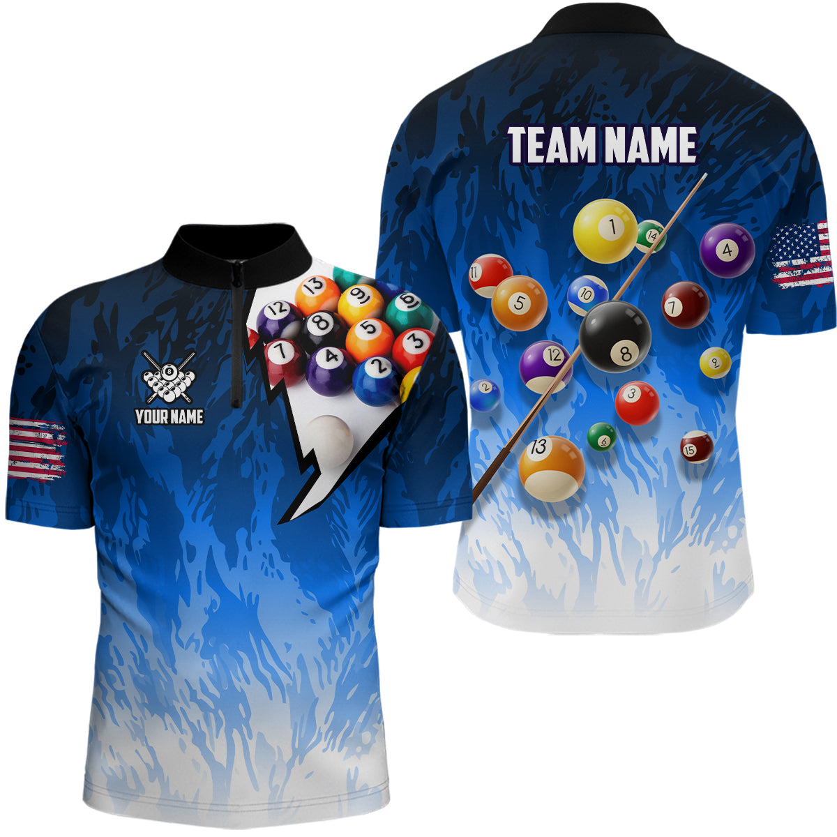 Personalized Blue Pool Player Billiard 8 Ball Polo & 1/4 Zip For Men Custom Billiard Shirts Jerseys TDM3656