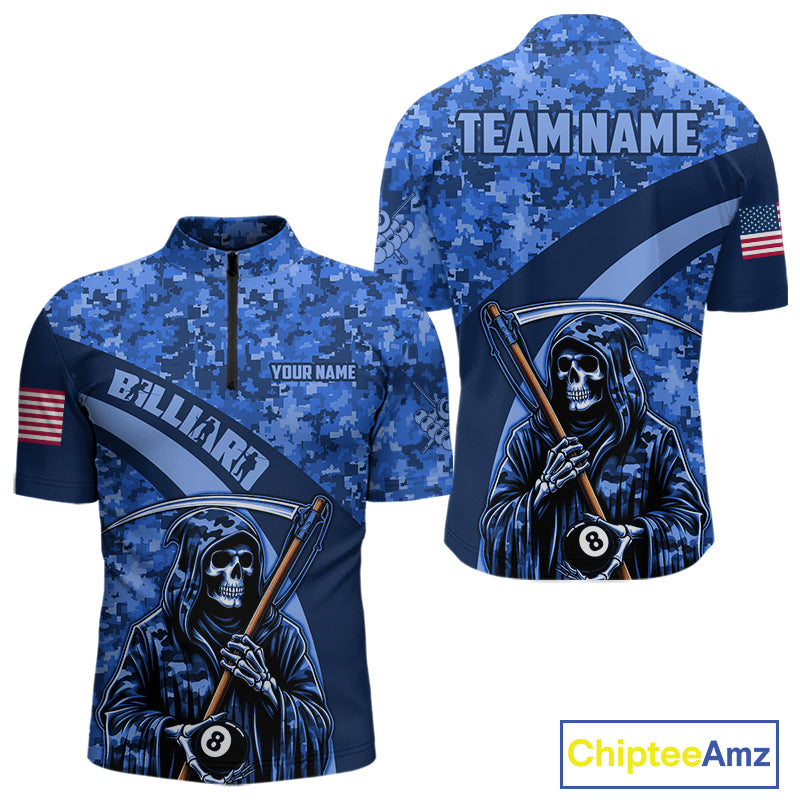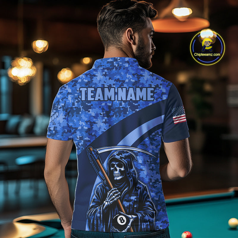 Personalized Death Skeleton Blue Camo Billiard Shirts For Men Custom Military Billiard Jerseys TDM3985