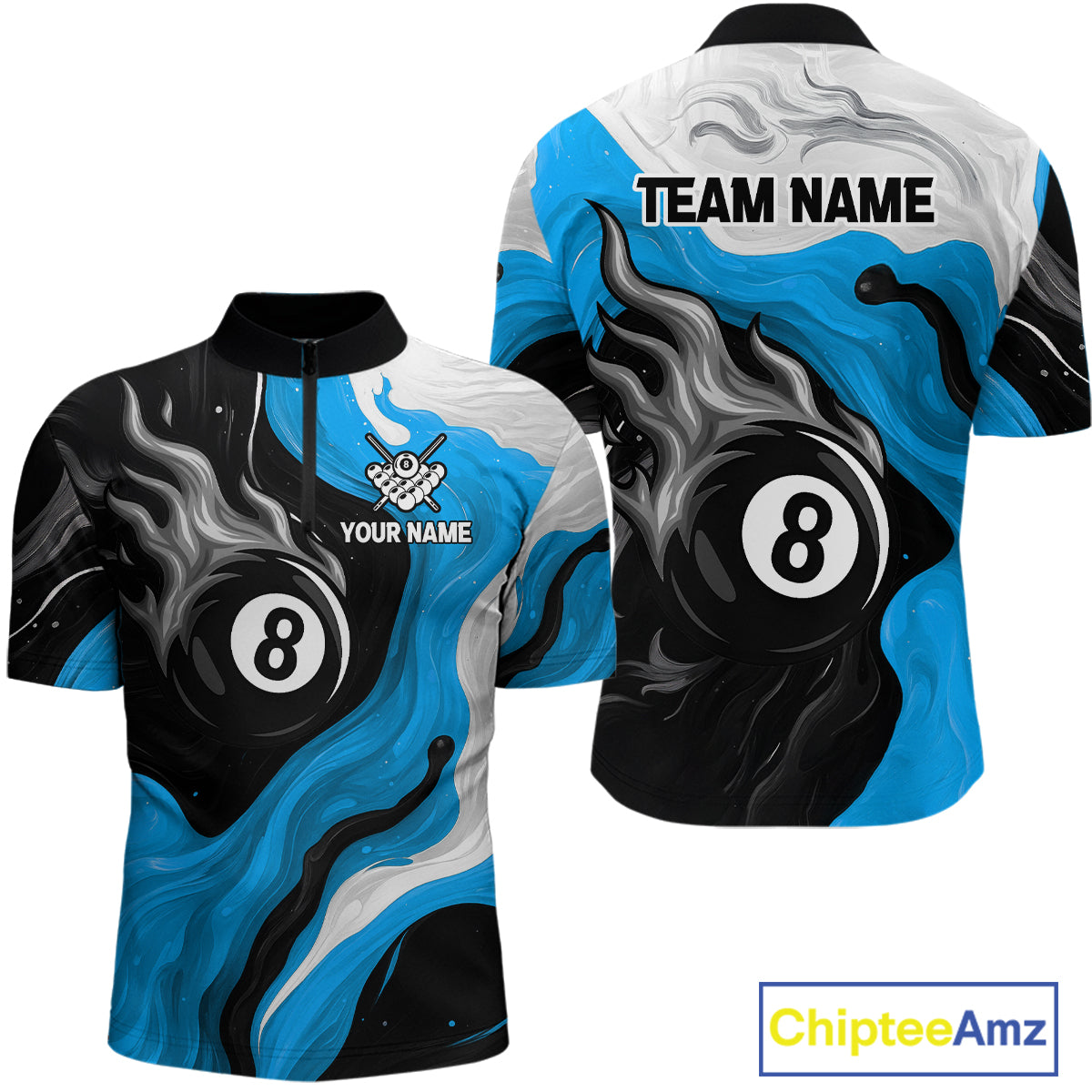 Personalized Black, Blue And White 8 Ball Flame Billiard Shirt For Men Custom Pool Team Jerseys TDM4189