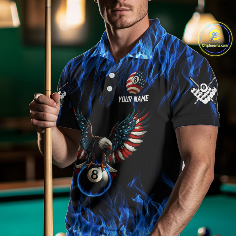 Blue Flaming American Flag Eagle 8 Ball Billiard Shirt For Men Custom Patriotic Pool Team Jersey TDM4231