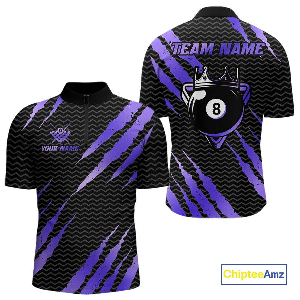 Black And Purple Scratch Billiard Shirt For Men Custom 8 Ball Crown Pool Team Jersey Polo, 1/4 Zip TDM4240
