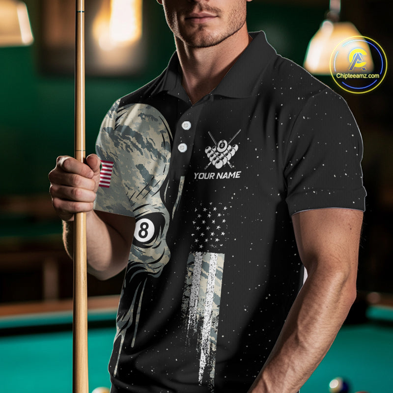 Grunge Camo Skull American Flag Billiard Shirt For Men Custom Patriotic 8 Ball Pool Team Jersey TDM4276