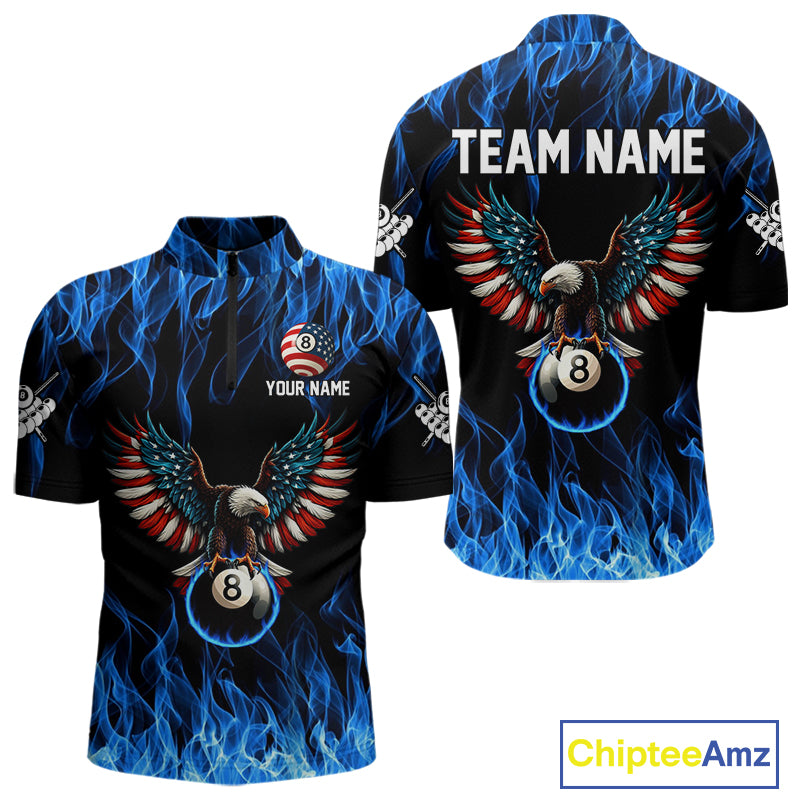 Blue Flaming American Flag Eagle 8 Ball Billiard Shirt For Men Custom Patriotic Pool Team Jersey TDM4328