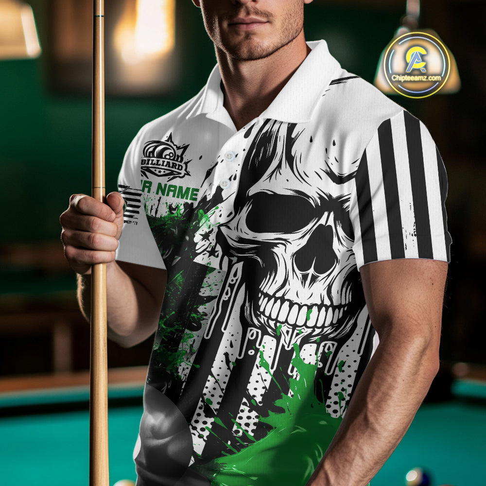 Personalized Green Grunge Skull Billiards Shirts For Men Custom Retro Billiard Team Jerseys Attire TDM4650